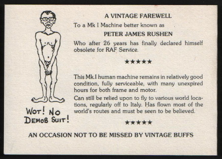 In the end the politics of the flight and the station got to me and I decided enough was enough, and I applied for Premature Voluntary Release. The system had the last word, I was made to serve the full eighteen months required even though I was prepared to go earlier. My last flight in the RAF was in the Avro Lancaster to Blackpool and back on the 14th August 1983. My first flight in an RAF aircraft had been in August 1955, twenty-eight years earlier, that time in an Avro Lincoln.